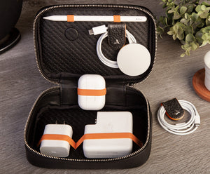 This is an everyday essential you didn’t know you needed until you have it! With an assortment of two strong elastic bands and two detachable leather jaw cable holders, our Mini Tango travel cord organizer will keep your cords tidy and chargers organized anywhere you go.