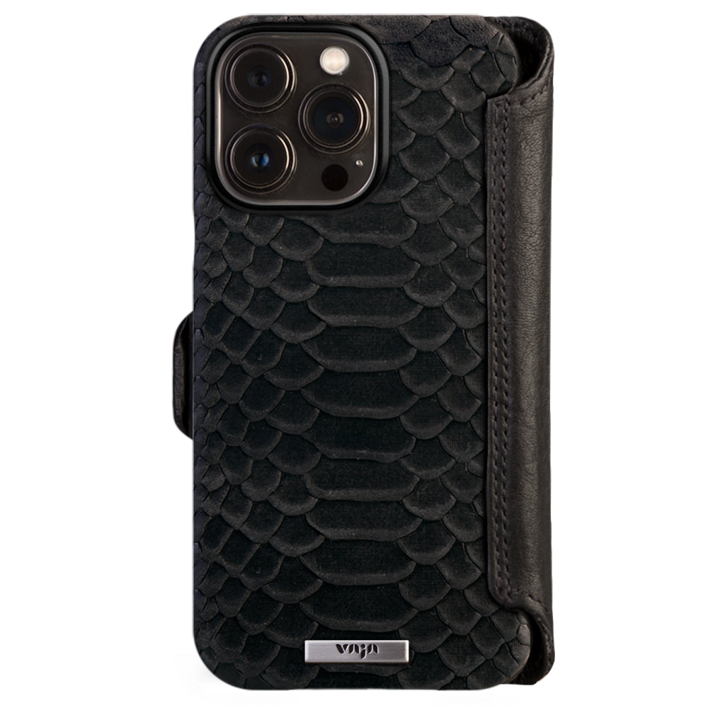 • Wallet for iPhone 15 Pro Max. Designed in limited batches, this wallet leather case is handcrafted to fit the iPhone 15 Pro Max, providing superior hand feel and protection. Each wallet features a high-defense black framed eyelet for the camera and a signature Vaja leather lining.Designed to hold up to 5 credit cards with RFID protection, it also offers a discreet compartment for folded bills, ensuring your essentials stay organized and secure. For added safety, the wallet case features a magnetic closure and is MagSafe ready. This case is not compatible with V-Mag add-ons.